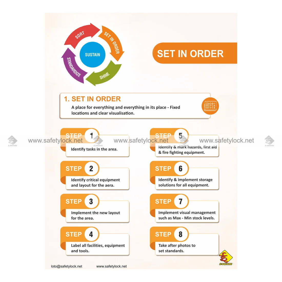 - These posters serve as a constant reminder of the 5S principles – Sort, Set in Order, Shine, Standardize, Sustain – helping to maintain high standards of workplace organization and safety.
