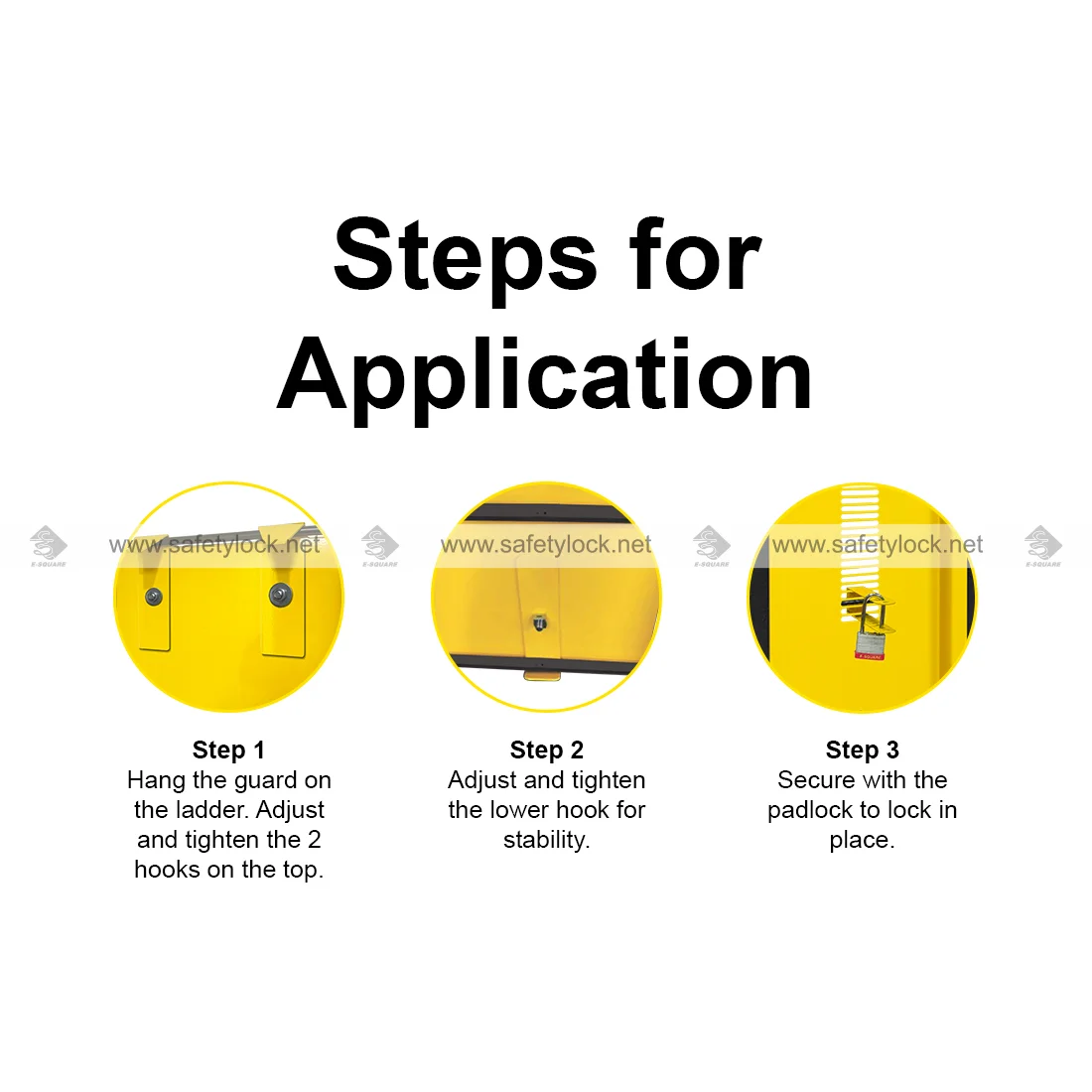 Step 1: Hang the guard on the ladder. Adjust and tighten the 2 hooks on the top.